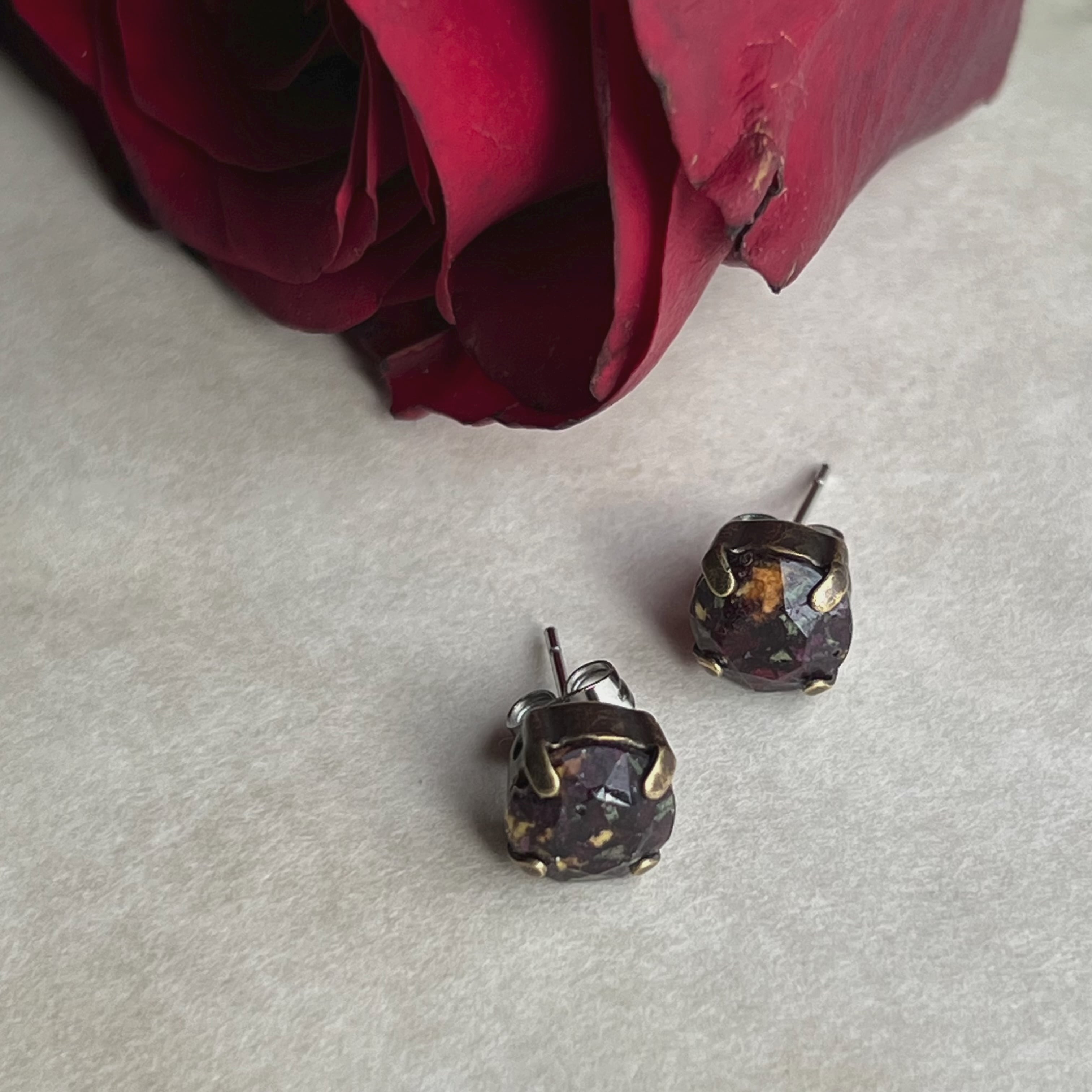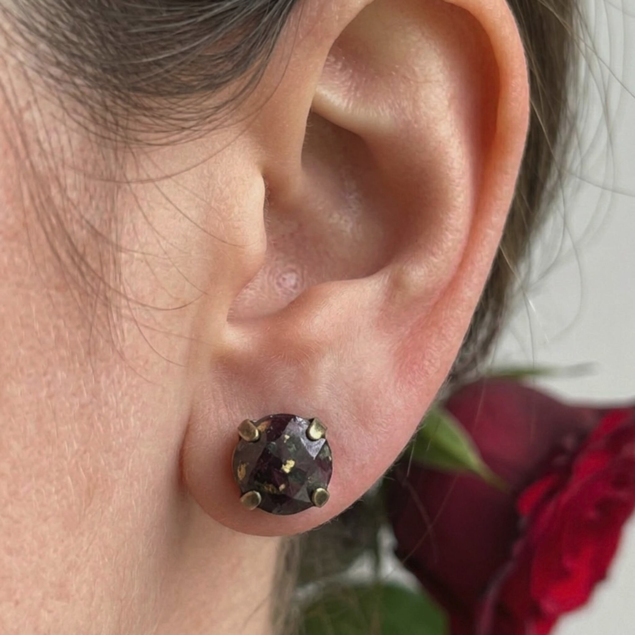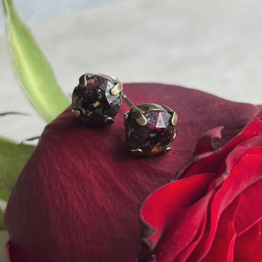 深い赤の花びらを閉じ込めた、落ち着いた印象のフラワーピアス。