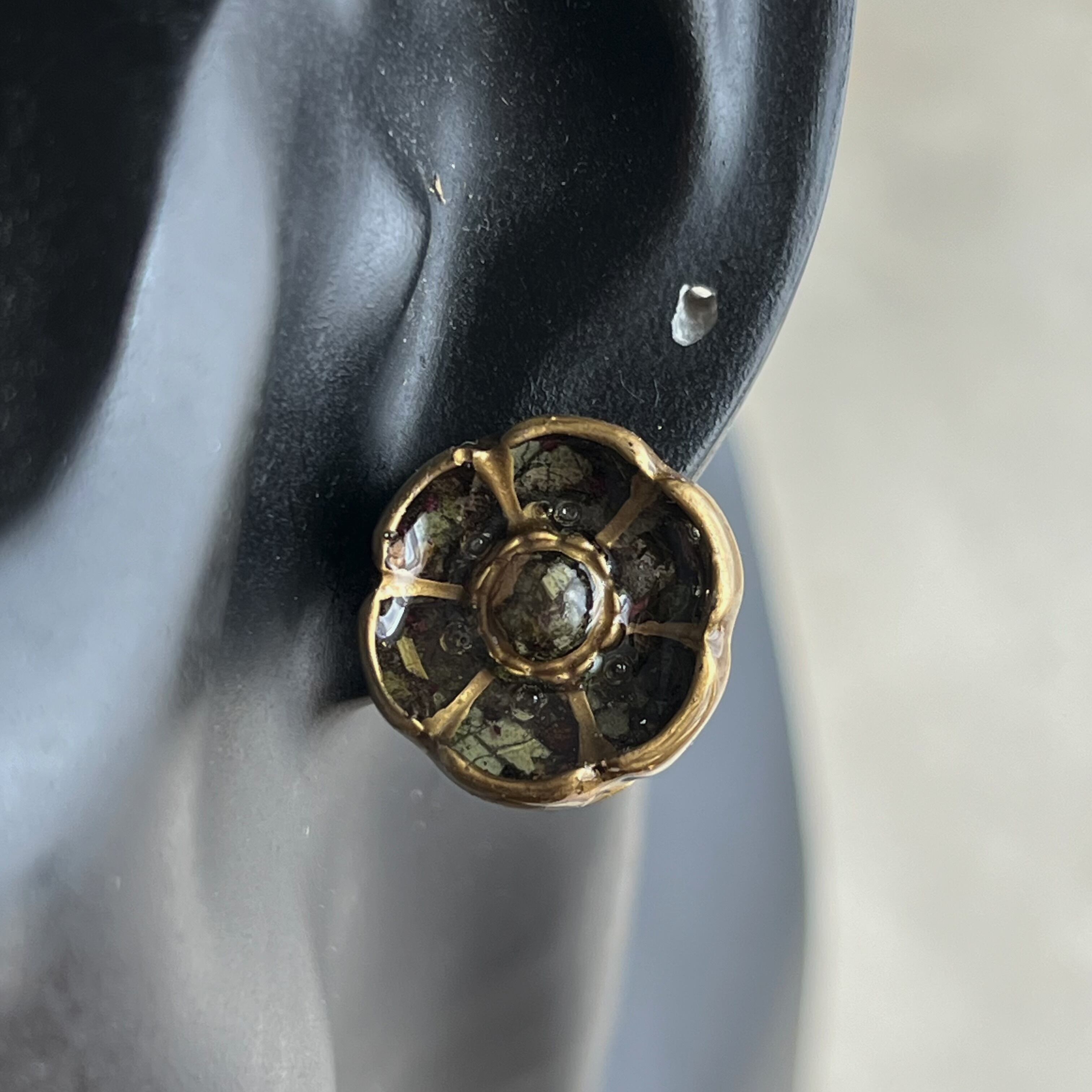 花を象るボタンを、花で彩ったピアスです。
