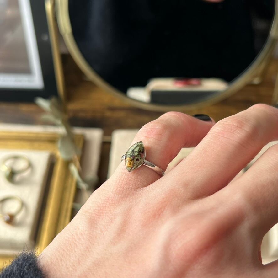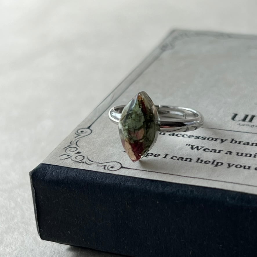 花を閉じ込めて生まれた特別なフォルムが、天然石のような奥行きを感じさせるピンキーリング。