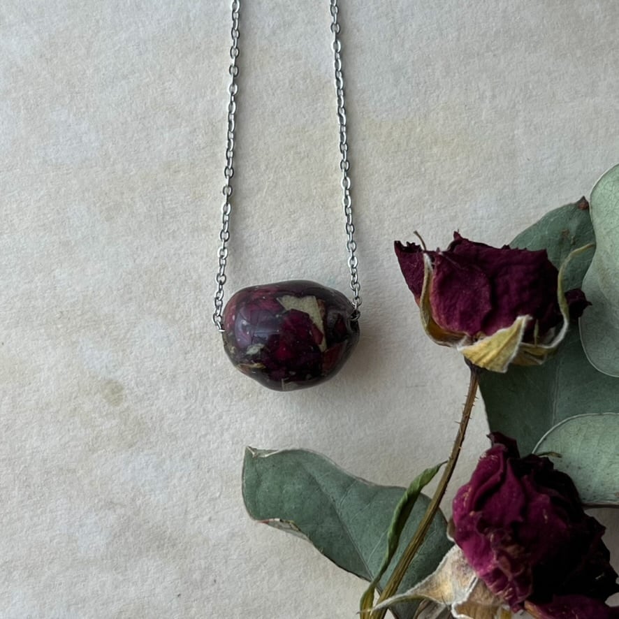 まるで大地から生まれた天然石のように、花びらや葉を閉じ込めて形作ったネックレス。